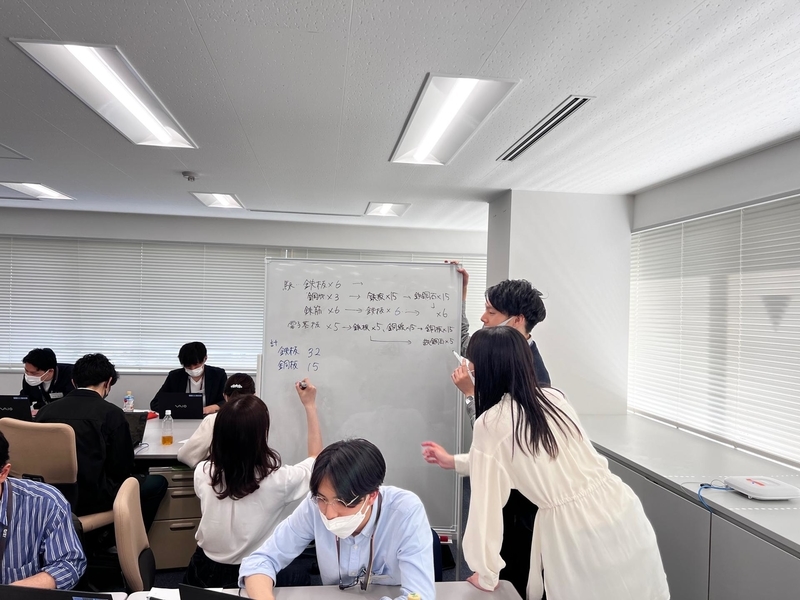 チーム生産シナリオでの実習を行いました。 納品完了までの時間の使い方は完全にチームに委ねたため、善は急げとすぐに資源を採掘し始めるチーム、急がば回れと全員で作戦会議をするチーム、間を取って戦略立案組と採掘組に分かれるチームなど、チームごとに様々な戦略で実習を進めていました。 運営側としては、このようにチームによって戦略がばらけているほど、振り返り内容の共有によって得られる気づきも大きいと考えていたため、目論見どおりといったところでした。