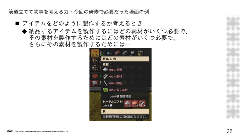 そこで、何か良い題材がないか探していたところ、このISIDテックブログの発起人でもある佐藤太一さんにFactorioを紹介いただきました。 先述のとおり、Factorioは自動化や効率化がキモであることから、SIerの営みと関連させて論理思考力を強化できるのではないかと考え、Factorioを題材とすることに決定しました。