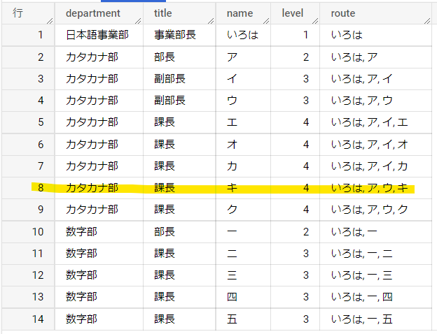 いろは事業部長から見てキさんはア部長の部下であるウ副部長の部下ですね。 つまり、levelカラムが示すように4層目にいて、その経路は「いろは→ア→ウ→キ」となるわけです。