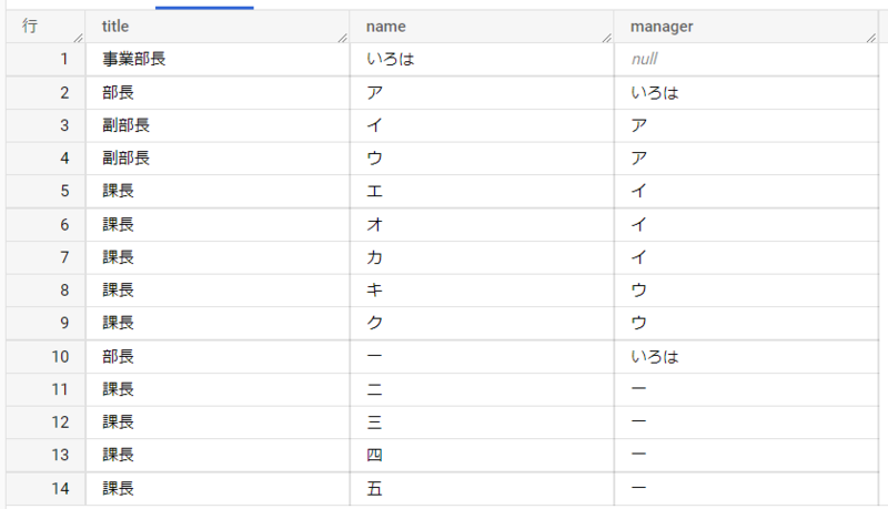 部長であるアさんと一さんのmanagerとしていろはさんが選択されていますね。 副部長や、課長の皆さんについても、対応するマネージャーが選択されています。