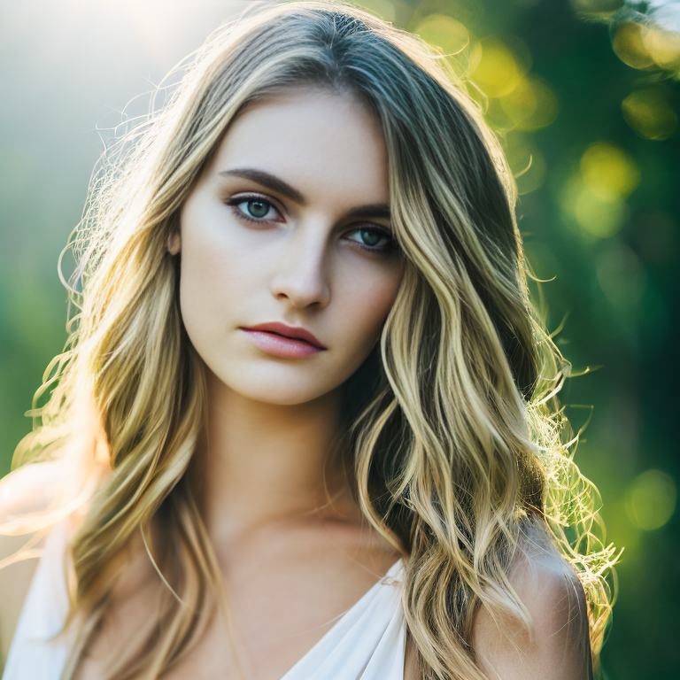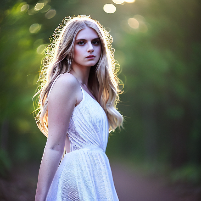 portrait of a blonde woman in a white dress posing for a picture, tumblr, digital art, glowing with colored light, ethereal lighting, forest ray light, taken in 2022, handsome girl, brooke ashling, diffused natural skin glow