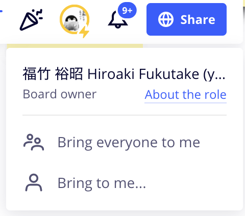 miroには、参加者全員の画面を強制的に自分の見ている範囲に移動させるBring everyone to meという機能があります。アジェンダの説明やBoard内の誘導には、こちらを有効に使いましょう。ただ「最初の説明」「議論の導入」の時など限られたタイミングだけで使うのがおすすめめです。『メンバーが迷子になることを防ぐ』目的にとどめて使うほうが、参加側には負荷がかからないように思います。
