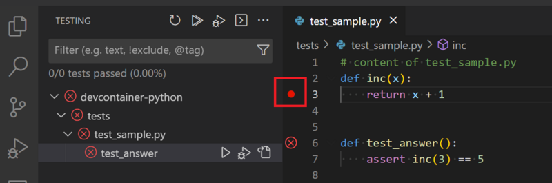 コンテナ内ではvscodeというユーザーで、 workspace/devcontainer-python というディレクトリをカレントディレクトリにしています。 ディレクトリパスのdevcontainer-python 部分はプロジェクトのルートディレクトリと同じになっているはずです。