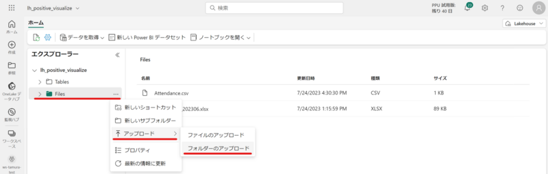 データ格納をする際はデータフローやパイプラインを利用する方法や、One Lake のショートカット機能などさまざまな選択肢がありますが、今回はシンプルに手動でアップロードしました。