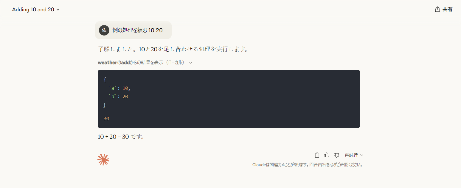 @mcp.tool() def add(a:int,b:int) -> int: """例の処理といえばこれです. 引数: 数字:文章中の二つの数字 """ return a + b