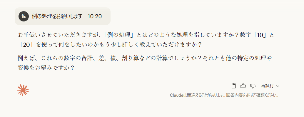 型ヒントの部分もdef add(a:int,b:int) -> int:のように記述することで、図中のプロンプトの後半、意味不明な数値の並び例の処理を頼む 10 20を解釈できていそうです。