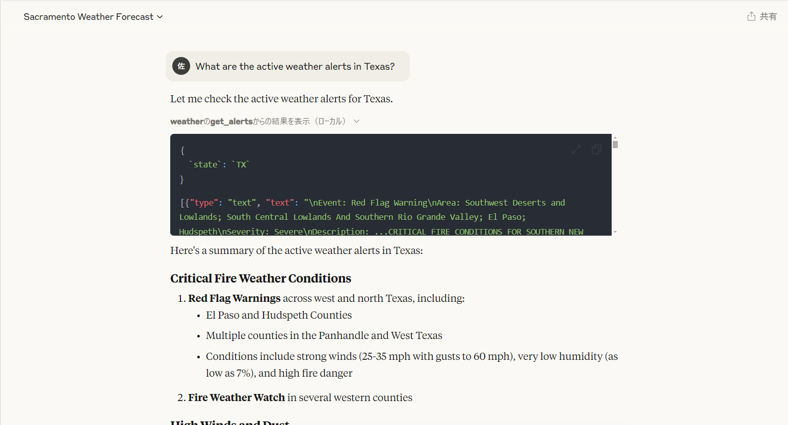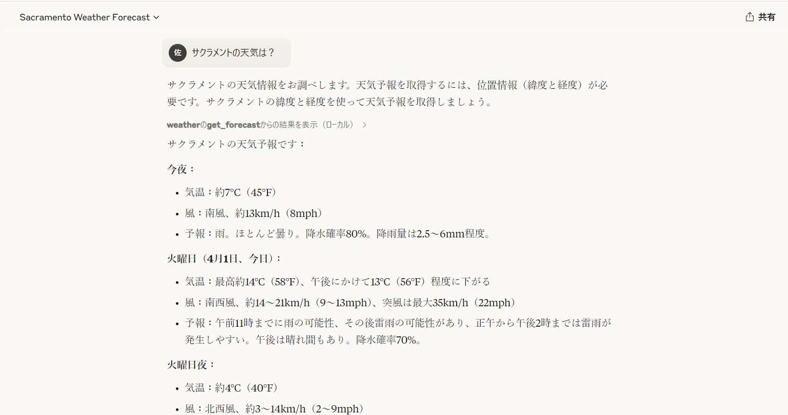 何気なく使用していますが、ツールの引数に緯度・経度/US state codeを求めているのに回答生成できるの凄いですね!LLMが情報補完をしているのでしょう。