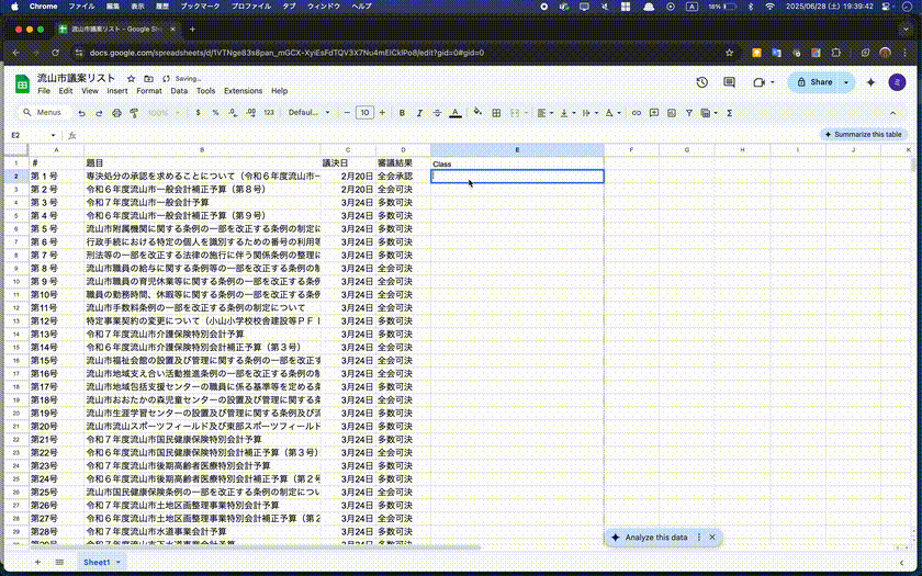 AI関数としてB列に含まれている議案がどのカテゴリに属するものか?を生成AIに分析してもらいます