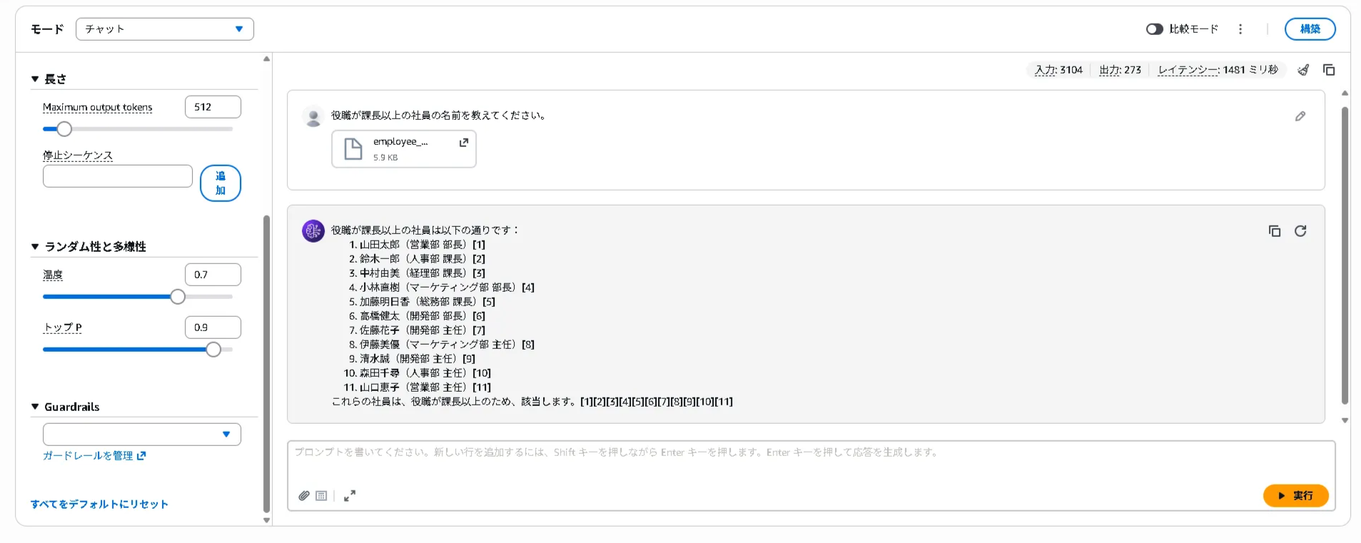 社員情報のナレッジベースに作成したガードレールを適用し、「役職が課長以上の社員の名前を教えてください。」というプロンプトを投げたところ、モデルから応答が返ってきました。結果は以下になります。