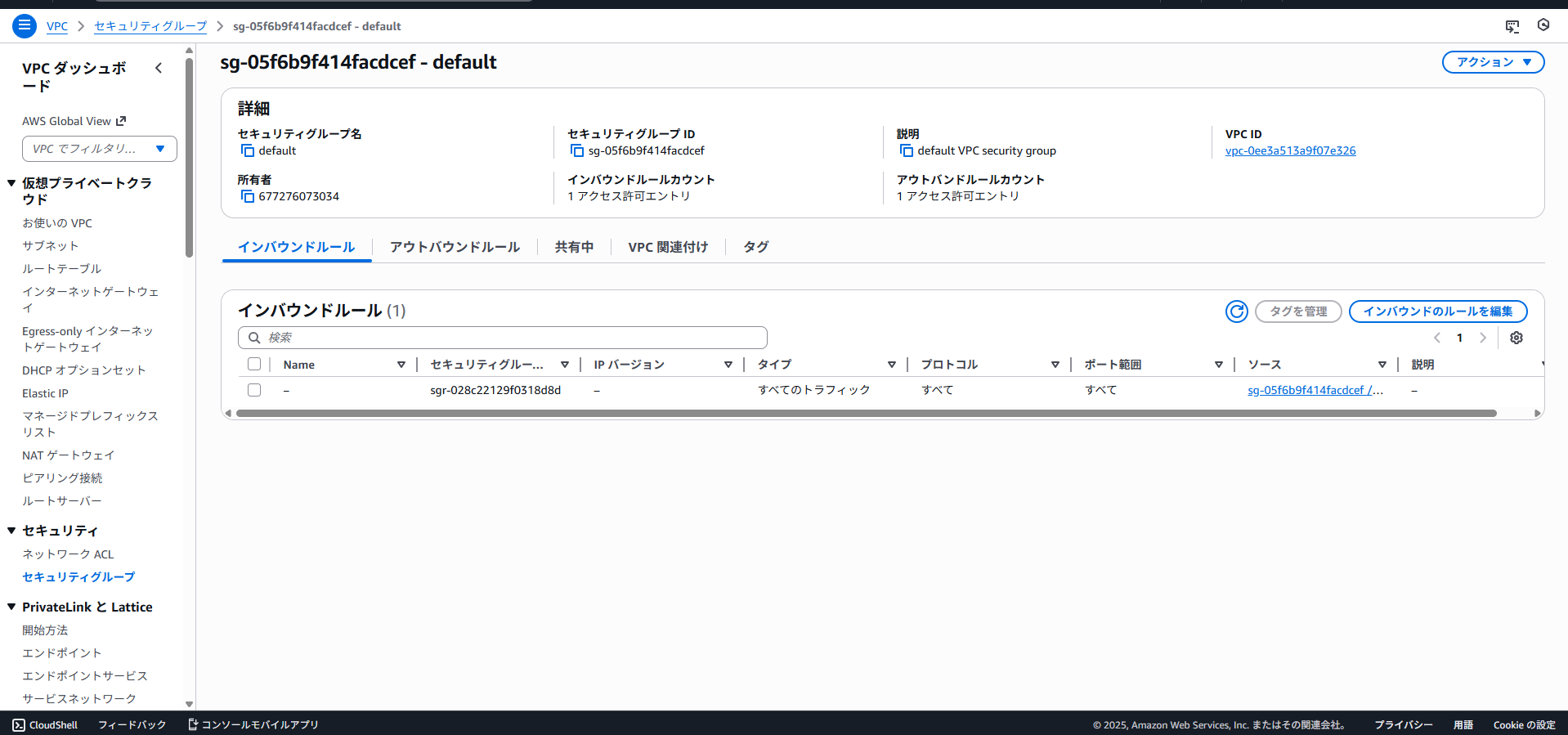 しかし、以下に示すようにVPCエンドポイントに付与されたセキュリティグループはデフォルト設定であり、クライアントEC2からのアクセスに非対応となっています。