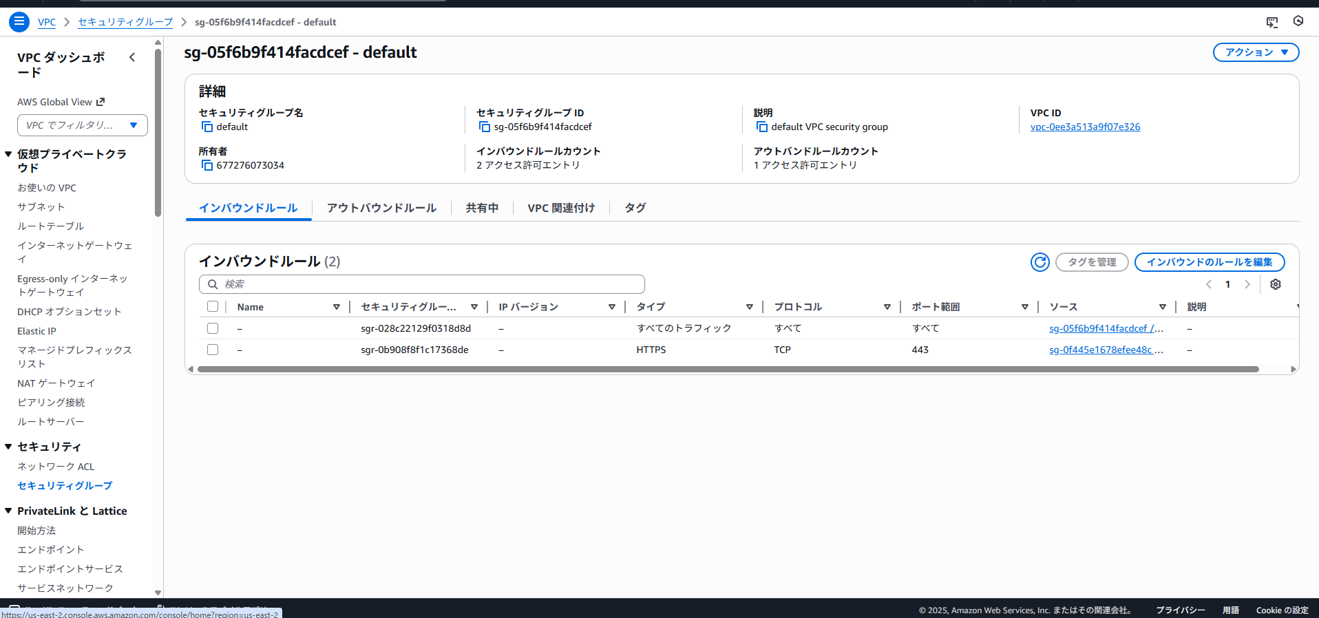 そのため、インバウンドルールにEC2セキュリティグループからのポート443への通信の許可を追加します。