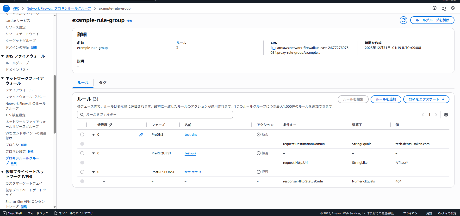 VPCコンソールのプロキシルールグループ画面より、「プロキシルールグループを作成」ボタンからルールグループを作成します。
